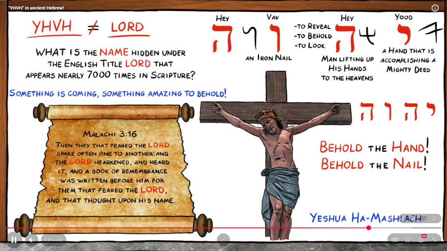 The very name of Yahweh in the ancient Hebrew pictograph alphabets (YHWH without the added vowels), is seen translated as “behold the hand, behold the nail.” Remarkable! The crucifixion prophecy was embedded in the very name of YHWH, the Word of God, the Son of God, The Second God, the Messiah, our Lord Jesus Christ.